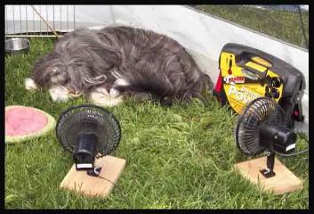| "It's hot, I've run my course, I've played with my Frisbee so now it's time to nap in front of my fans!" |